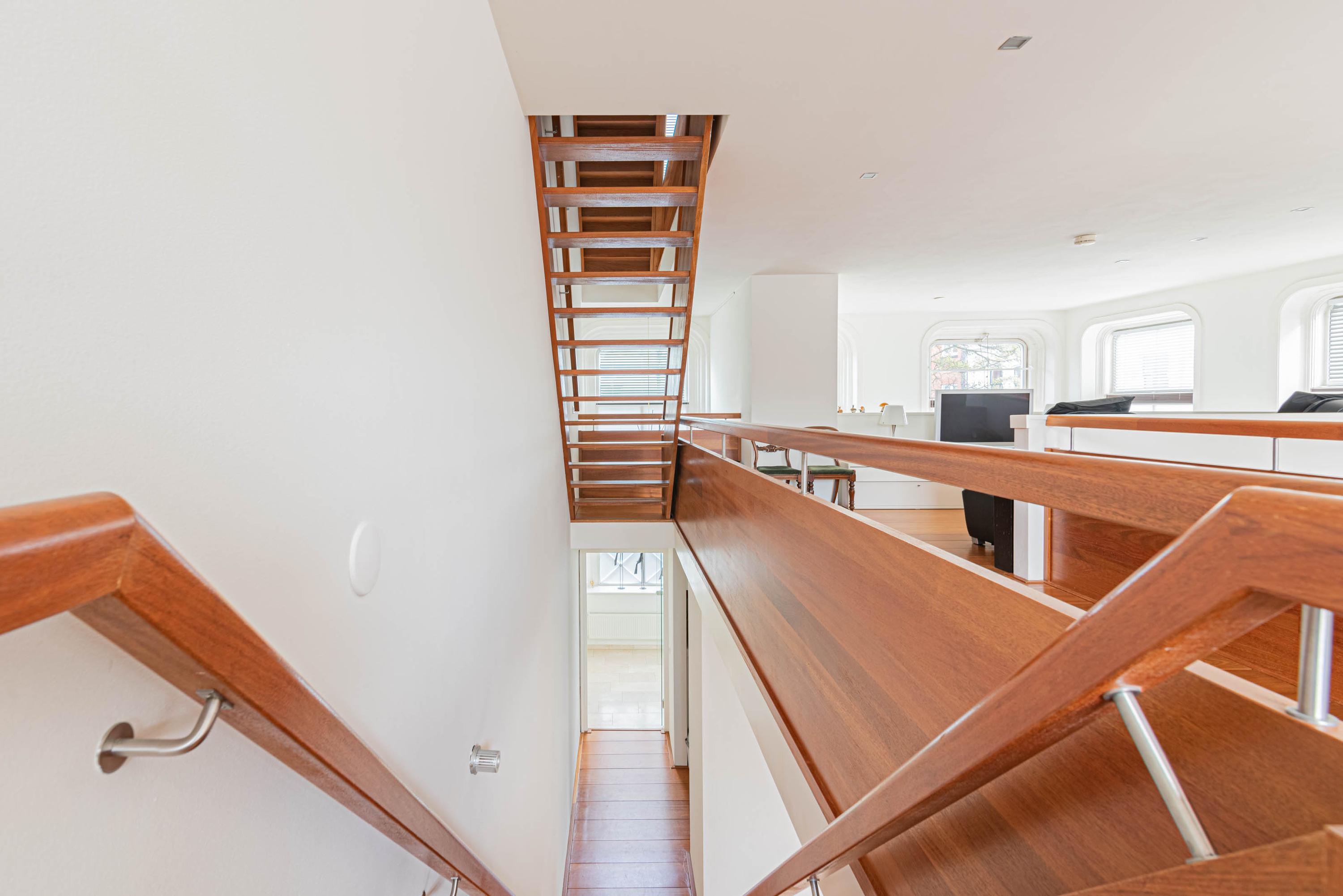 Een trappartij van hoogwaardig Braziliaans hardhout biedt toegang tot de mezzanine, die dienst kan doen als werk- of speelplek of tv-kamer. Ook de hier aanwezige massagefauteuils en tv blijven achter.